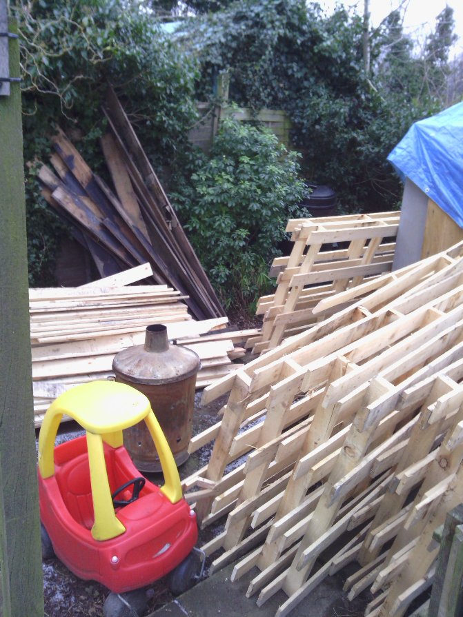 I was lucky as most of the wood to build the coop and run (with a shed load left over) has come free of charge in the form of pallets, 7 foot long pallets to be exact, I saw them in the car park of an industrial unit that was being re-furbished and asked the people doing the work if I could have them, they said yes, one chap even gave me a lift with a load, which when you only have a push bike and small trailer is a good thing.